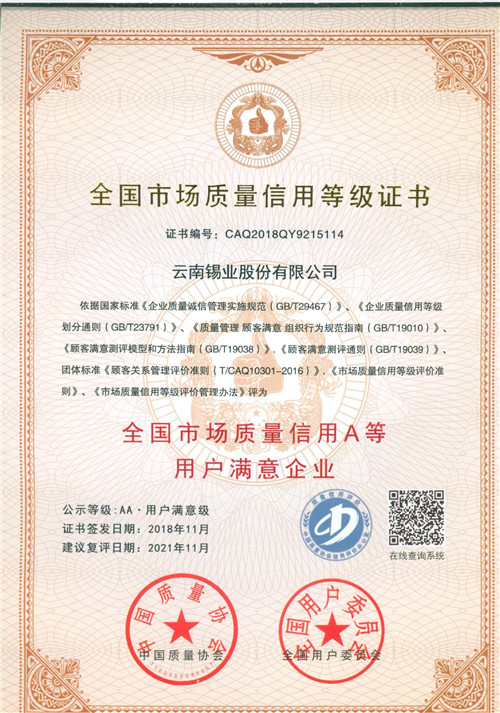 錫業股份積極參加中國質量協會組織的“2018年度市場質量信用等級評價”活動,通過企業申請、行業協會推薦、第三方專業機構評價、專家評審、委員會審定、征詢意見等程序審核,對申報企業的質量信用意愿、質量保障能力、市場經營能力等三個一級指標及若干個二、三級指標進行綜合評價,全面綜合考核企業的誠信建設與市場質量信用管理能力和水平,錫業股份榮獲“2018全國市場質量信用AA等用戶滿意企業” 榮譽證書及獎牌。