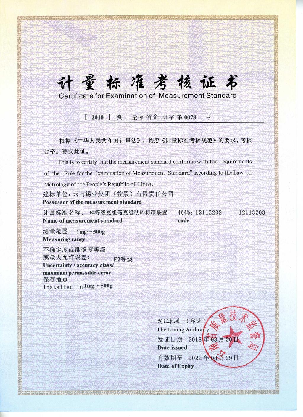 云南省質量技術監督局計量標準考核專家組從計量標準器及配套設備、計量標準器的主要計量特性、環境條件和設施、人員配置、管理制度辦法制定和實施情況、計量標準測量能力等方面對各項計量標準裝置進行審查,一致認為云錫各項計量標準的運行條件和測量能力滿足國家《計量標準考核規范》的要求,對11項計量標準給予一次通過復查考核。