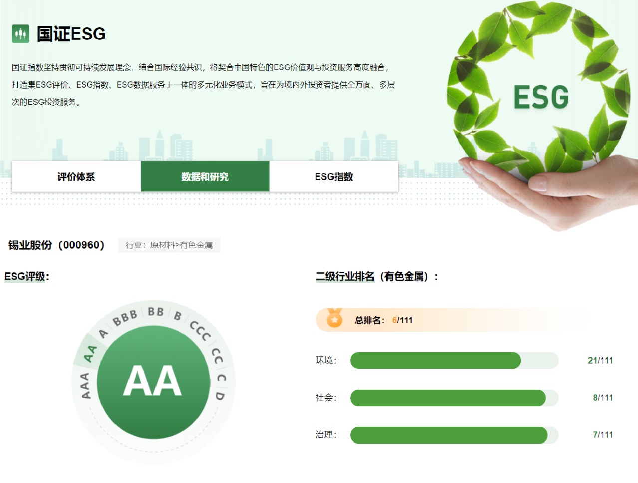 近日,深圳證券交易所全資子公司深圳證券信息有限公司正式推出了國證ESG(環(huán)境、社會和公司治理)評價方法,并發(fā)布了基于該評價方法編制的ESG基準(zhǔn)指數(shù)和ESG領(lǐng)先指數(shù)。錫業(yè)股份憑借在社會責(zé)任、公司治理和生態(tài)環(huán)保等方面的優(yōu)異表現(xiàn),國證ESG評級達到AA,位居深交所有色金屬行業(yè)111家上市公司的第六位,同時位列深交所上市的云南有色上市公司首位,并成功入選深指ESG基準(zhǔn)指數(shù)和深指ESG領(lǐng)先指數(shù)。