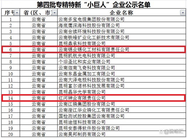 云南20家!云錫錫化工、紅河砷業公司入選
