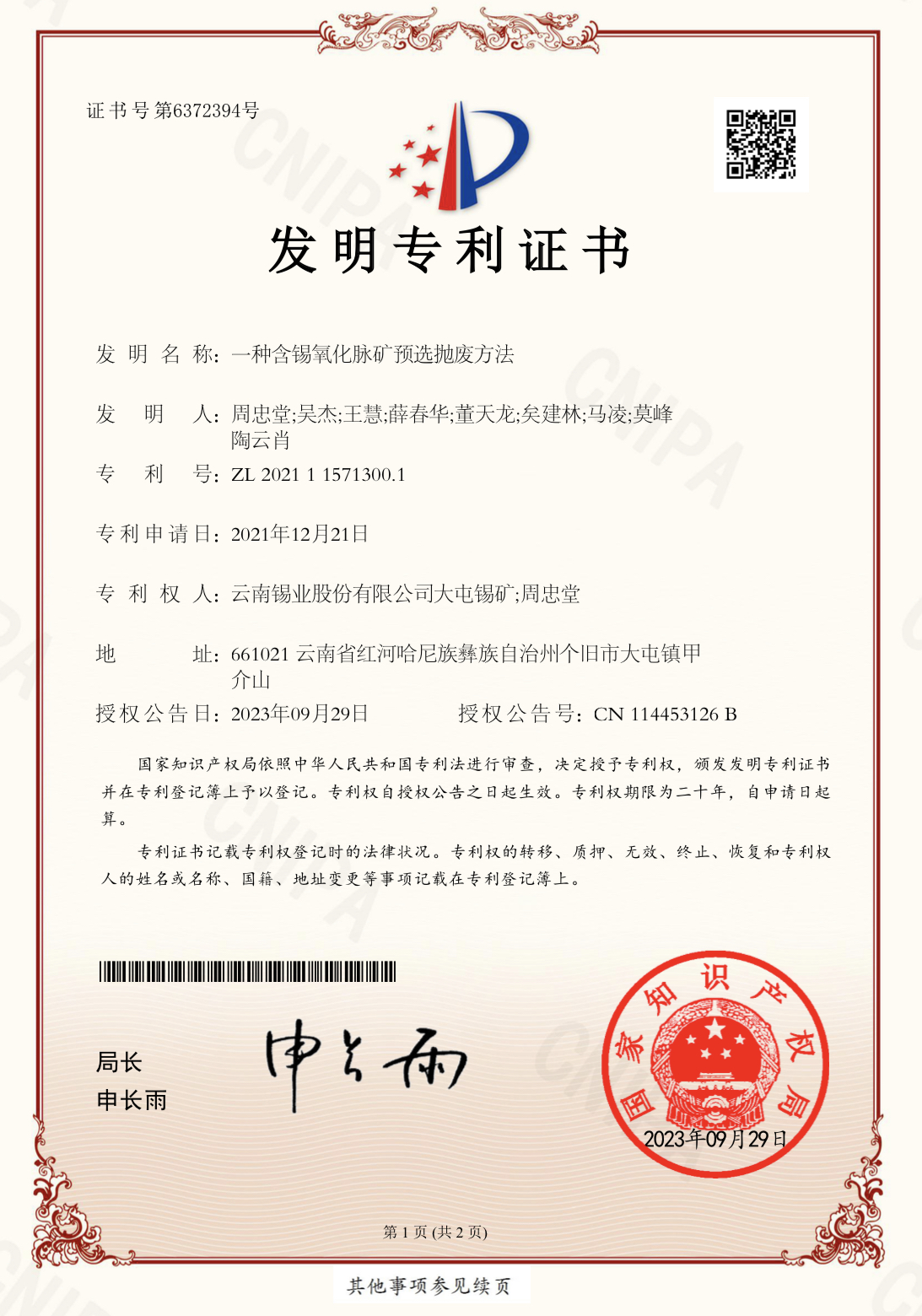 9月29日,繼大屯錫礦研發的“一種銅錫共生硫化礦預選分級選礦方法”發明專利于2023年6月獲國家知識產權局正式授權的基礎上,大屯錫礦“一種含錫氧化脈礦預選拋廢方法”再獲國家發明專利!