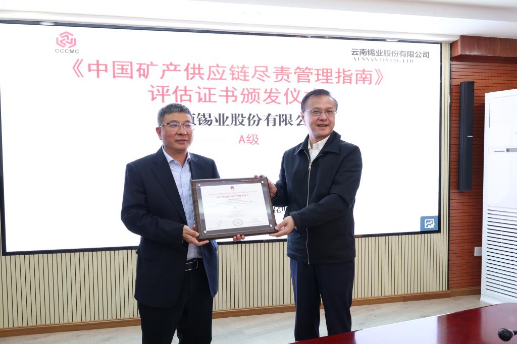 中國五礦化工進出口商會為錫業股份頒發《中國礦業供應鏈盡責管理指南》評估證書
