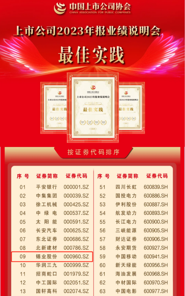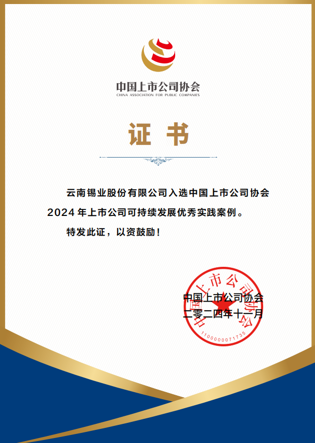 近日,中國上市公司協會發布“2023年報業績說明會最佳及優秀實踐”和“2024中國上市公司可持續發展最佳實踐案例”。錫業股份成功入選“2023年報業績說明會最佳實踐”,這也是公司第三次入選該榜單;“數智引領 以信息化賦能產業環節高質量發展”案列成功入選2024上市公司可持續發展優秀實踐案例。