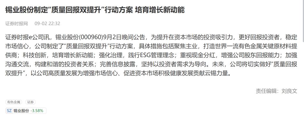證券時(shí)報(bào)網(wǎng):錫業(yè)股份制定“質(zhì)量回報(bào)雙提升”行動方案 培育增長新動能